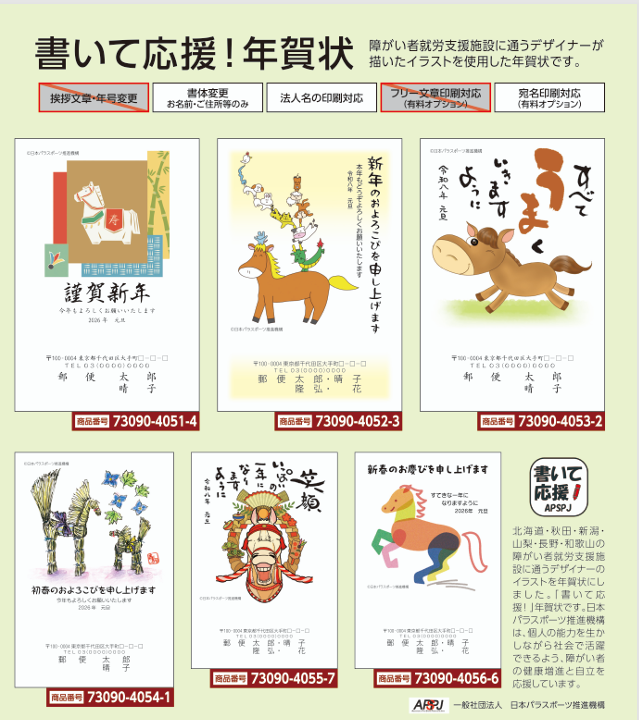 ★午年「書いて応援!年賀状」は、北海道・秋田・新潟・山梨・長野・和歌山の障がい者就労支援施設に通うデザイナーが描いたイラストが採用されています。そして、全てのはがきに「©日本パラスポーツ推進機構」が印字されていますぜひ、ご覧ください。